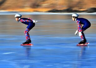 Kars'ta sürat pateni (short track) sporcuları, soğuk havanın etkisiyle yüzeyinin büyük bölümü donan Çıldır Gölü'nde yaptıkları antrenmanlarla Türkiye Şampiyonası'na hazırlanıyor.