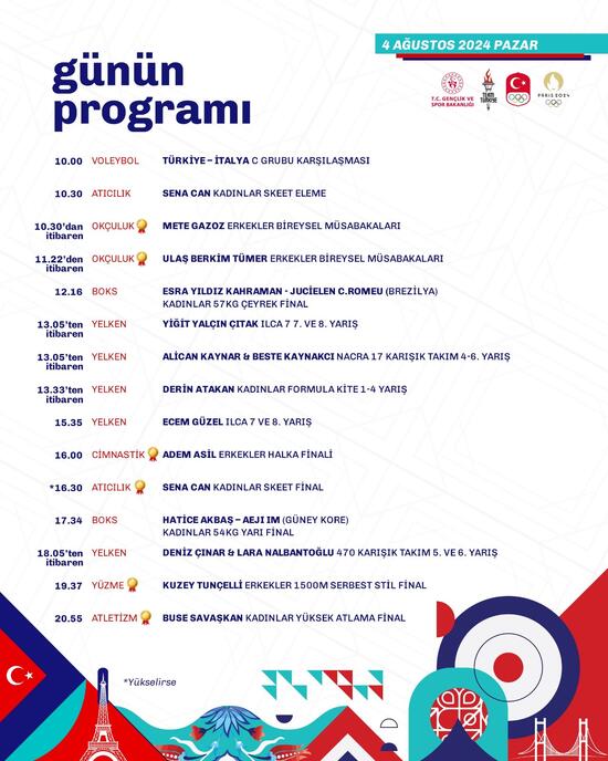 *16.00: Adem Asil (Cimnastik Erkekler Halka Finali) - 5. oldu*16.30: Sena Can (Atıcılık Kadınlar Skeet Final) - Elemeyi geçerse17.34: Hatice Akbaş - Aeji Im (Kadınlar 54 Kilo Boks Yarı Final)