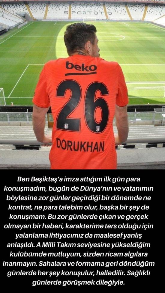 Bu dönemde bir talebi olmayacağını belirten milli oyuncu, "Ben Beşiktaş'a imza attığım ilk gün para konuşmadım, bugün de Dünya'nın ve vatanımın böylesine zor günler geçirdiği bir dönemde ne kontrat, ne para talebim olur, başka bir şey de konuşmam. Bu zor günlerde çıkan ve gerçek olmayan bir haberi, karakterime ters olduğu için yalanlama ihtiyacımız da maalesef yanlış anlaşıldı. A Milli Takım seviyesine yükseldiğim kulübümde mutluyum, sizden ricam algılara inanmayın. Sahalara ve formama geri döndüğüm günlerde her şey konuşulur, halledilir. Sağlıklı günlerde görüşmek dileğiyle." ifadelerini kullandı.