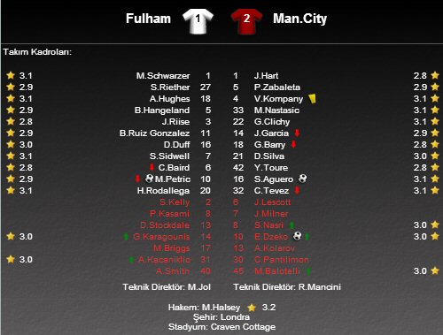 Fulham'ın golünü 10. dakikada penaltıdan Petric atarken, Manchester City'nin gollerini 43. dakikada Sergio Agüero ve 87. dakikada Edin Dzeko kaydetti.