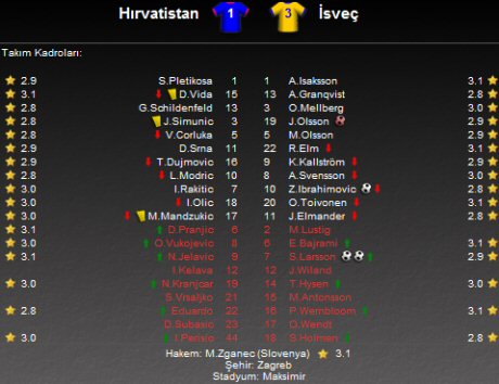 Dünya futbolunda hafta arası futbol heyecanı milli maçlarla devam ederken; Galatasaraylı Johan Elmander ve İstanbul Büyükşehir Belediyesporlu Samuel Holmen'in ülkesi İsveç, deplasmanda Hırvatistan ile karşılaştı.