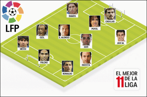 Kalede Iker Casillas yüzde 55 oy ile kaleyi kimseye kaptırmadı. Üçlü savunma hattında Sergio Ramos, Carles Puyol ve Javi Martinez yer aldı. Orta 4'lüyü Xabi Alonso, Xavi, Iniesta ve Mesut Özil oluştururken; forvet hattında ise en fazla oyu Lionel Messi, Radamel Falcao ve Cristiano Ronaldo aldı.