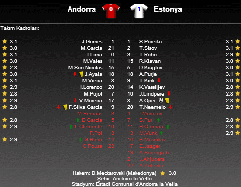 Estadi Comunal d'Andorra la Vella da oynanan karşılaşmayı Estonya 1-0 kazanarak ilk puanlarını galibiyetle almış oldu.