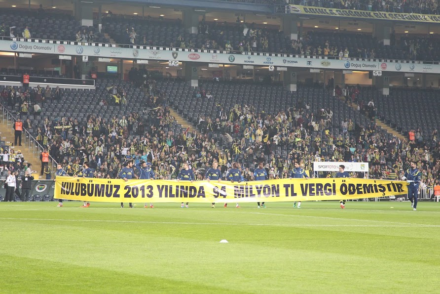 Süper Lig'in 22. haftasında Gençlerbirliği'ni ağırlayan sarı lacivertliler maç öncesinde ısınmaya "Kulübümüz 2013 yılında 94 milyon TL vergi ödemiştir" yazılı bir pankartle sahaya çıktı.