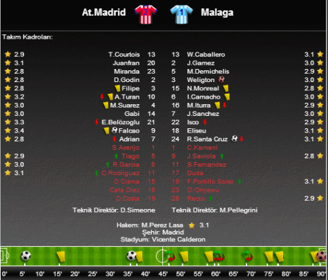 Atletico Madrid'in gollerini 6 ve 90. dakikalarda Radamel Falcao kaydederken; Kolombiyalı yıldızın kaydettiği ilk golün asisti Emre Belözoğlu'ndan geldi. Karşılaşmada Malaga'nın tek golünü ise 36. dakikada Santa Cruz kaydetti.
