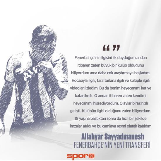 Fenerbahçe'nin İran takımlarından Esteghlal'den kadrosuna kattığı 18 yaşındaki Allahyar Sayyadmanesh 5 yıllık resmi sözleşmeye imza attı. Fenerbahçe'den yapılan açıklamada, "Kulübümüz, İranlı santrafor Allahyar Sayyadmanesh ile anlaşmaya varmıştır. Fenerbahçemiz, 2001 doğumlu futbolcuyu 2023-24 sezonunun sonuna dek renklerine bağlamıştır" denildi.