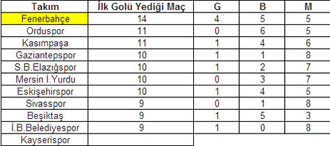 Fenerbahçe bu sezon Süper Lig’de oynadığı 20 maçta 14 kez ilk golü kalesinde gördü. Fenerbahçe 1-0 geriye düştüğü bu 14 maçta 4 kez kazanırken 5 galibiyet 5 beraberlik aldı. Fenerbahçe bu sezon Süper Lig’de ilk golü en çok yiyen takım oldu.