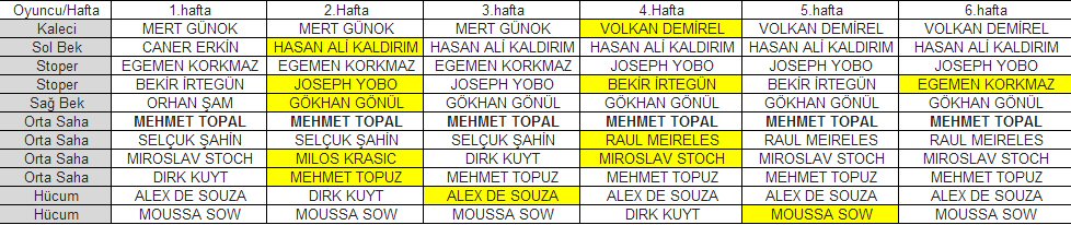 Fenerbahçe geride kalan 6 haftada 22 farklı oyuncusuna süre verirken her maça farklı 11 ile başladı. Sakatlıklar nedeniyle büyük sıkıntı yaşayan Aykut Kocaman özellikle hücumda her maçta farklı dizilişler denedi. Her maçta ilk 11’de oynayan tek oyuncusu ise Mehmet Topal oldu. Fenerbahçe takımında son haftada ise 5.haftada oynayan ilk 11’den sadece 1 oyuncu (Bekir yerine Egemen) değişmişti.