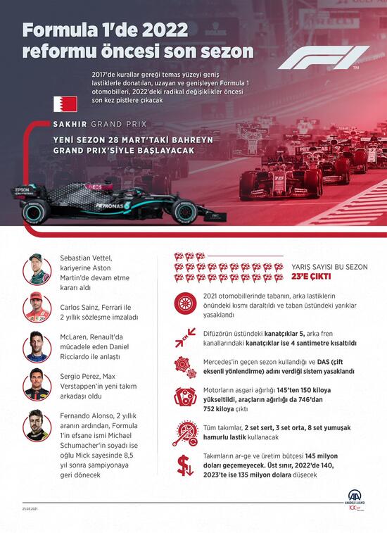 2017 kurallarıyla ortaya çıkan otomobillerin son sezonu olacak 2021 Formula 1 Dünya Şampiyonası, yeni takımlar ve yeni yüzlerin yanı sıra tanıdık isimlerin dönüşünü de izleme fırsatı sunacak.