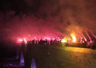 Davul zurna eşliğinde eğlenen taraftarlar, havai fişek gösterisinin ardından meşaleler yaktı.
