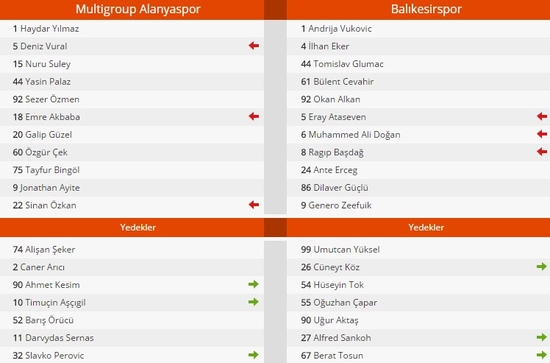 Multigroup Alanyaspor: Haydar Yılmaz, Deniz Vural (Dk. 86 Timuçin Aşcıgil), Ayite, Suley, Emre Akbaba (Dk. 85 Perovic), Galip Güzel, Sinan Özkan (Dk. 77 Ahmet Kesim), Yasin Palaz, Özgür Çek, Tayfur Bingöl, Sezer Özmen