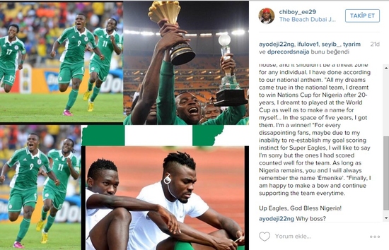 Kişisel Instagram hesabından uzun bir açıklama yapan 28 yaşındaki golcü oyuncu, 5 yıl forma giydiği Nijerma Milli Takımı'nda artık yer almayacağını duyurdu.