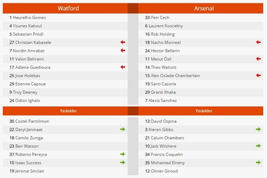 Arsenal'de Mesut Özil ilk 11'de başladığı maçta 70 dakika sahada kaldı. Watford'da Nordin Amrabat, 11'de sahaya çıktı ve 77 oynadığı maçta penaltıyı yaptıran isim oldu.