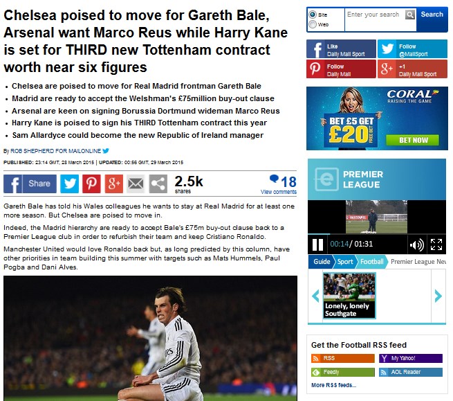 ''Daily Mail''in haberine göre Galli oyuncu Real Madrid'de kalmak istese de, Chelsea'nin transferdeki ısrarı devam ediyor. Londra temsilcisinin Bale'in serbest kalma bedeli olan 75 milyon poundu ödemeye hazır olduğu belirtilirken, Manchester City'nin Finansal Fair-Play kuralları nedeniyle bu transferde bir adım geride olduğu ifade edildi.