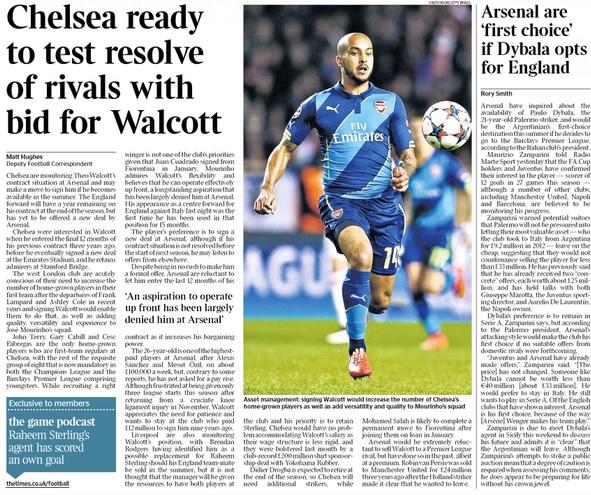İngiliz basınında çıkan iddialara göre Jose Mourinho'nun çalıştırdığı Chelsea'nin yeni hedefi Arsenal forması giyen Theo Walcott oldu. 2016 yılında Arsenal ile sözleşmesi bitecek olan ve Arsenal ile yeni sözleşme görüşmelerine başlamayan Walcott için devreye giren Chelsea, yaz transfer döneminde yıldız ismi kadrosuna katmak istiyor.