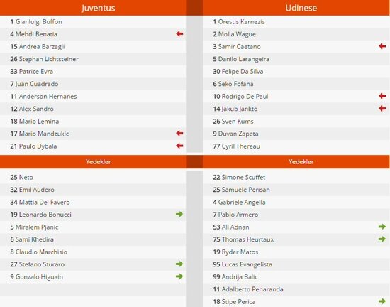 Udinese deplasmanda Jakub Jankto'nun 30. dakikada bulduğu golle 1-0 öne geçti. Juventus, 43 ve 51. (penaltı) dakikada Paulo Dybala'nın golleriyle galibiyete ulaştı.