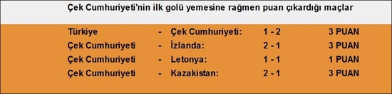 Grupta oynadığı 8 karşılaşmada 19 puan toplayan çek Cumhuriyeti, bu 19 puanın yarısından fazlasını yenik duruma düşmesine rağmen kazanmayı başardı. Çekler, Türkiye, izlanda, Letonya ve Kazakistan maçlarında ilk golü kalelerinde görmelerine rağmen toplamda 10 puan almayı başardı. A Milli Takımımız'ın da kritik karşılaşmada en çok dikkat etmesi gereken noktaların başında, Çekler'in bu alışkanlık haline getirdikleri geri dönüşleri olmalı...