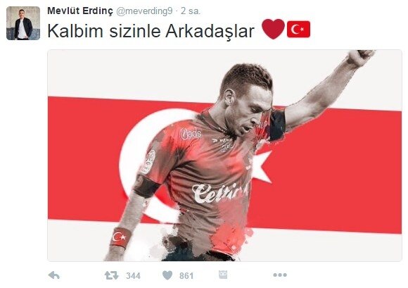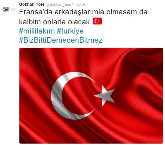 2 maçlık cezası bulunan ve Fransa kadrosuna giremeyen Gökhan Töre, kişisel Twitter hesabından; "Fransa'da arkadaşlarımla olmasam da kalbim onlarla olacak." sözlerini kullanırken kadroya dahil edilmeyen bir başka isim Mevlüt Erdinç de; "Kalbim sizinle arkadaşlar" mesajı paylaştı.