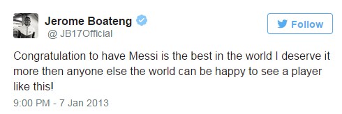 Öte yandan Boateng'in büyük bir Messi hayranı olduğu ortaya çıktı. Alman milli savunmacının, 7 Ocak gübü Messi'nin 4. Altın Top ödülünü kazanmasının ardından, "Dünyanın en iyisi olan Messi'yi kutlarım" şeklinde bir msaj yolladığı belirtildi.