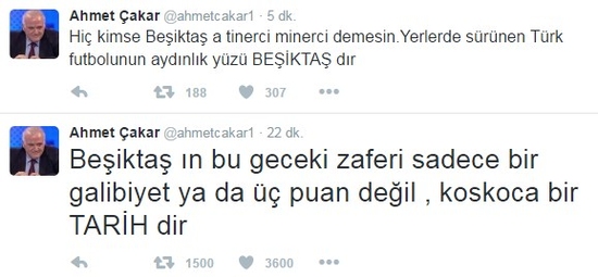 Çakar, Beşiktaş'ın önemli bir zafer kazandığını söylerken; "Beşiktaş'ın bu geceki zaferi sadece bir galibiyet ya da üç puan değil, koskoca bir TARİHdir. Hiç kimse Beşiktaş'a tinerci minerci demesin. Yerlerde sürünen Türk futbolunun aydınlık yüzü BEŞİKTAŞ'dır" ifadelerini kullandı.