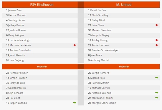 Manchester United, eski PSV'li Memphis Depay'ın 40. dakikada attığı golle öne geçerken, PSV Eindhoven, 45. dakikada Hector Moreno ile beraberliği yakaladı. Hollanda temsilcisi, 57. dakikada Hollanda Milli Takımı'nın da önemli isimlerinden Luciano Narsingh ile 2-1'i yakaladı ve maçı da bu skorla tamamladı.