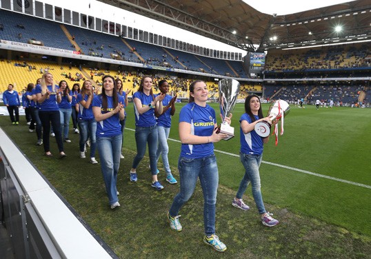 Bayanlar Voleybol 1. Lig'de şampiyon olan Fenerbahçe Grundig'in oyuncuları, karşılaşma öncesi kupalarıyla saha içinde tur attı. Yapılan anonsla stada giriş yapan sarı-lacivertli kadın voleybolcular, stat hoparlörlerinde Fenerbahçe marşı çalındığı sırada saha kenarından yürüyerek taraftarı selamladı.