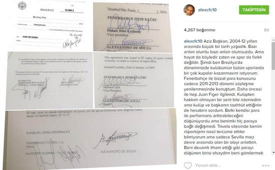Kişisel Instagram hesabından Aziz Yıldırım'ım resmi site aracılığıyla paylaştığı makbuz ve diğer evrakların resmini yayınlayan Alex, yaptığı açıklamada Fenerbahçe'nin bugün yayınladığı belgelerdeki imzalar ile kendi attığı imzaların farklı farklı olduğunu belirterek şu cümleyi kullandı; "Başkan, benim imzam 2004 yılında gelirken attığım ve 2012 yılında ayrılırken attığımla aynı, hiç değişmedi. Bakın ve ne sonuç çıkarılması gerekiyorsa çıkarın."