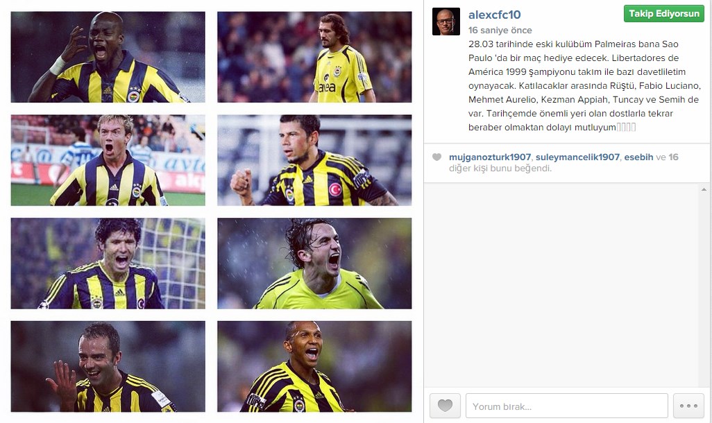 Paylaşımında Fenerbahçeli takım arkadaşlarının fotoğraflarına yer veren Alex, "28 Mart'ta eski kulübüm Palmeiras bana Sao Paulo'da bir maç hediye edecek. Maçta, 1999 Libertadores Kupası şampiyonu takım ile bazı davetlilerim oynayacak. Katılacaklar arasında Rüştü, Luciano, Aurelio, Kezman, Appiah, Tuncay ve Semih de var. Kariyerimde önemli yeri olan dostlarla tekrar beraber olmaktan dolayı mutluyum" ifadelerini kullandı.