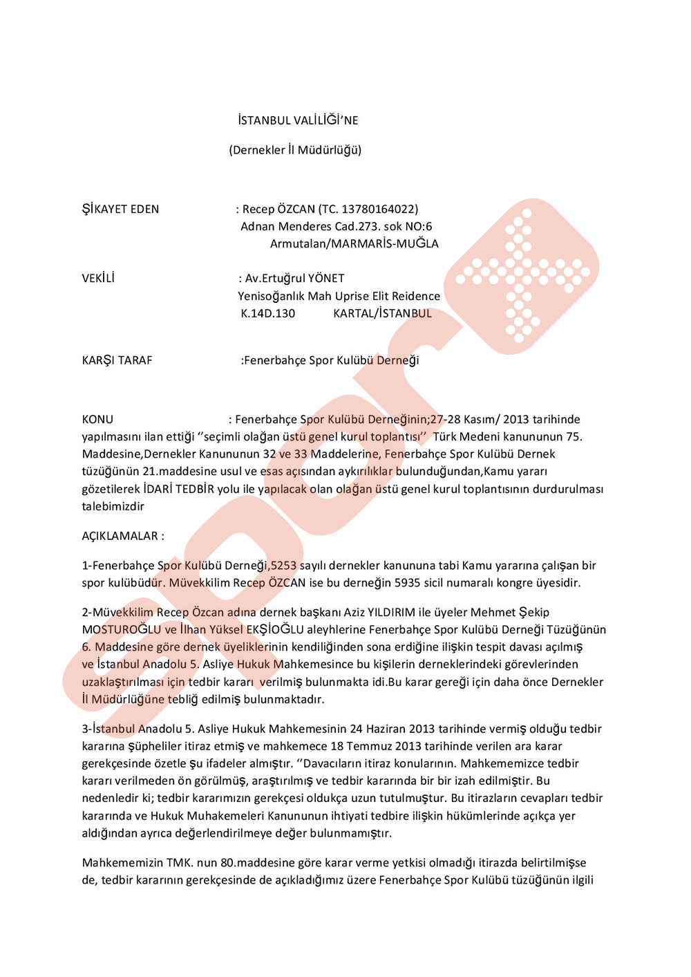 İŞTE RECEP ÖZCAN'IN GENEL KURULU DURDURMA TALEBİNDE BULUNDUĞU İSTANBUL VALİLİĞİNE VERDİĞİ O DİLEKÇE