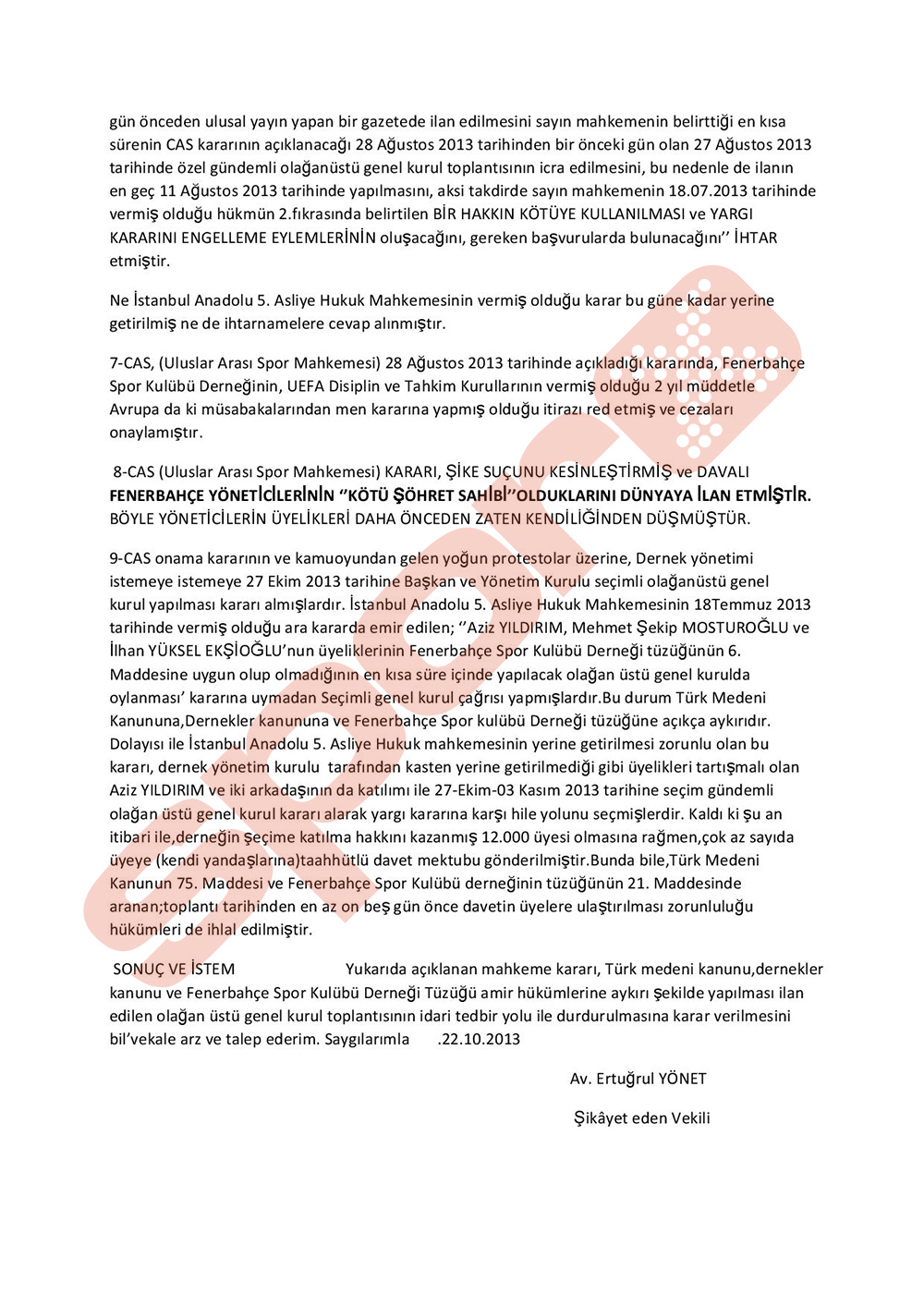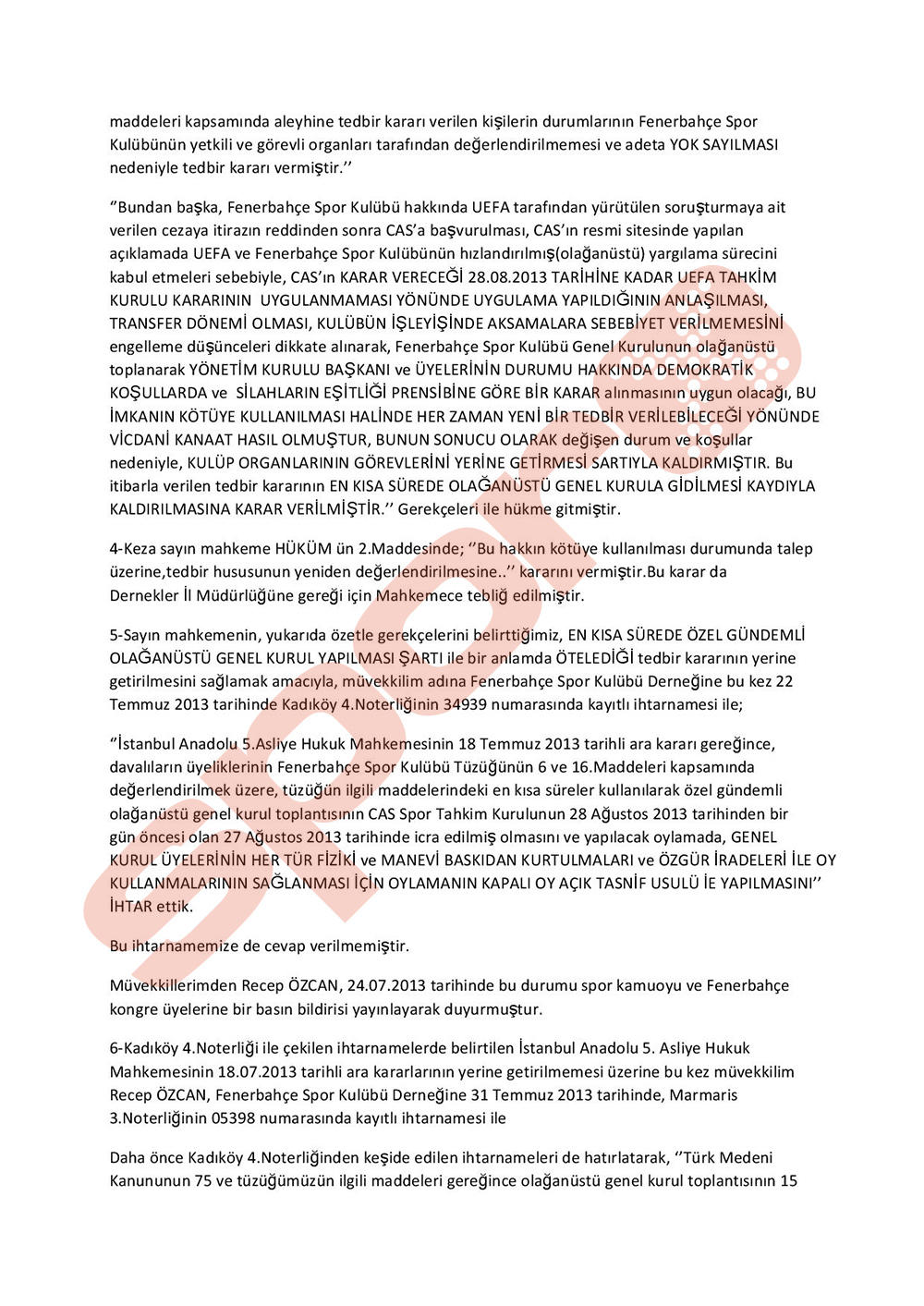 Yasal Uyarı: Bu haber kaynak gösterilmeden kullanılamaz. Özcan avukatı Ertuğrul Yönet aracılığı ile öğle saatlerinde İstanbul Valiliğine sarı-lacivertlilerin genel kurulunun durdurulması talebinde bulundu. İstanbul valiliği dernekler il müdürlüğüne yapılan başvuruda yapılacak olan genel kurulun, "Türk medeni kanununu 75. maddesine Dernekler kanununun 32 ve 33. maddelerine F.Bahçe Spor kulübü tüzüğünün 21. maddesine usul ve esas açısından aykırılıklar olduğu" gerekçesiyle genel kurulun iptaleni talep etti.