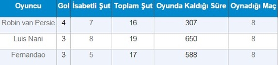 Fenerbahçe’nin Hollandalı yıldız oyuncusu Robin van Persie, toplamda 5 gol attı. Süper Lig’de 4 gol ve Avrupa kupalarında bir gol atan van Persie, bu gollerinin 4 tanesini deplasmanda kaydetti. Atromitos, Beşiktaş, Kayserispor ve Ç.Rizespor deplasmanlarında gol atan Hollandalı oyuncu sadece Bursaspor’a iç sahada gol attı.
