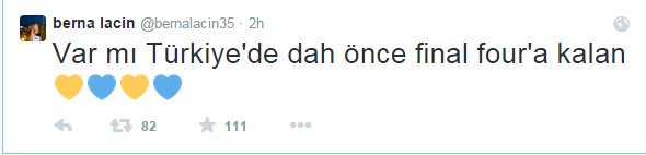 Fenerbahçeli olan ünlü oyuncu Berna Laçin ve ile yine sarı lacivertli kulübe gönül veren eski basketbolcu Mehmet Okur arasında yaşanan diyalogda, Laçin; "Var mı Türkiye'de daha önce final four'a kalan" dedi. Mehmet Okur ise; "Efes Pilsen ve o takımda olan Ben..." diye yanıt verdi.