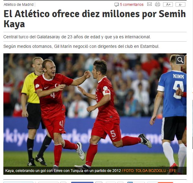Mundo Deportivo'nun iddiasına göre geçtiğimiz ay Türkiye'ye gelen ve Galatasaray yönetimi ile görüşen Miguel Angel Gil, 10 milyonluk bonservis bedeli konusunda sorun yaşadı. Ocak ayında Semih Kaya'yı renklerine katmak isteyen Atletico'nun Arda Turan'ı gayrıresmi olarak yetkilendirdiği ve Semih'le milli takım kampında konuşmasını istediği ifade edildi.