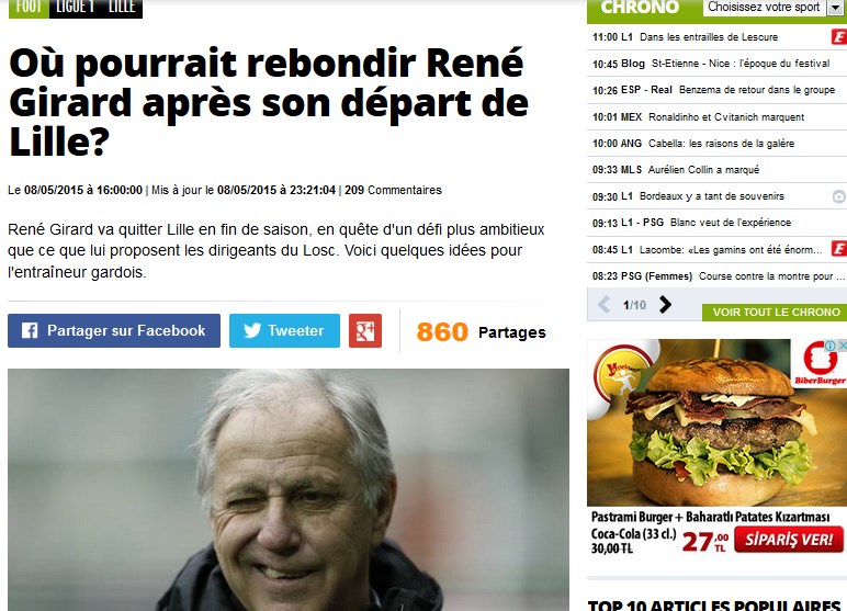 Fransa'nın önde gelen gezetelerinden L'Equipe, Lille'de sezon sonunda ayrılacak olan Rene Girard'ın, eskiden olduğu gibi adından başarıyla söz ettirmesi için çalıştırabileceği takımlar arasında Galatasaray'ı da gösterdi.