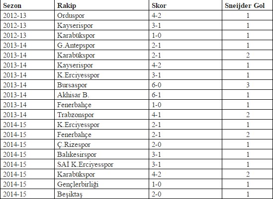 Bu sezon 8 farklı maçta, geçen sezon 8 farklı maçta ve 2012-13 sezonunda ise 3 farklı maçta gol atan Sneijder toplamda 25 gol attı.
