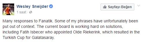 Sözlerinin çarpıtıldığını ve yanlış aktarıldığını belirten Sneijder kişisel Facebook hesabından; "Ben yönetim ve Fatih İşbecer'in çözüm üretmek için çalıştığını ve Jan Olde Riekerink'i takımın başına getirerek Türkiye Kupası'nı kazanmamızla biten süreci iyi yönettiğini söyledim." açıklamasını yaptı.