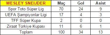 Geride kalan dönemde 70 Süper Lig, 17 Şampiyonlar Ligi, 2 TFF Süper Kupası ve 11 Ziraat Türkiye Kupası maçında oynayan Sneijder 34 gol atıp 13 asist yaptı.