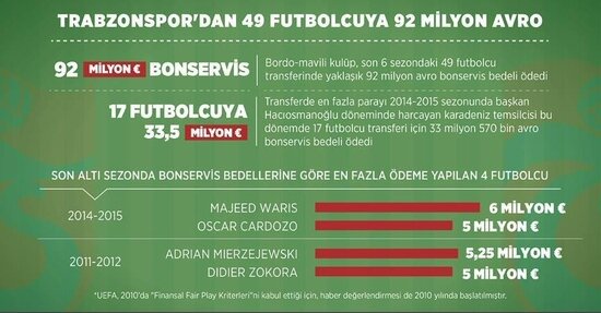 Son yıllarda transferler için yaptığı harcamalar nedeniyle mali açıdan sıkıntılı süreçten geçen Trabzonspor Kulübü, 6 sezonda futbolcu bonservisleri için yaklaşık 92 milyon avro ödedi.