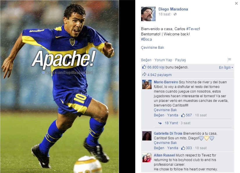 Arjantin'in efsane ismi, resmi Facebook hesabından yaptığı açıklamada, "Boca'ya Hoşgeldin Carlos Tevez" ifadelerini kullandı.