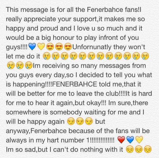 "Bu mesaj tüm Fenerbahçe taraftarlarına. Bana olan desteğiniz için minnettarım. Bu beni çok mutlu etti ve gururlandırdı. Sizi çok seviyorum ve sizin içn oynamaktan ötürü gururluyum. Ancak maalesef yönetim sizin için oynamama izin vermiyor. Sizlerden birçok mesaj geliyor ve bu yazıyla neler olduğunu anlatmak istiyorum."