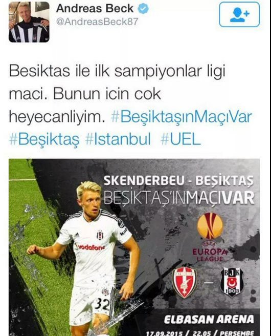 Andreas Beck, kişisel Twitter hesabından attığı tweet'te UEFA avrupa ligi'ndeki Skenderbeu-Beşiktaş maçının duyurusunun yer aldığı bir görseli paylaşırken, üstüne Türkçe olarak, "Beşiktaş ile ilk şampiyonlar ligi maçı. Bunun için çok heyecanlıyım" diye yazdı.