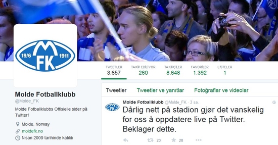 Molde Kulübü'nün resmi twitter hesabı, mücadele öncesi karşılaşmanın twitter hesabı üzerinden canlı olarak aktarılamayacağını açıklarken, bunun sebebini yeterli internet bağlantısının olmaması olarak gösterdi. Resmi hesaptan bu durum takipçilere, ''Stadyumdaki düşük internet bağlantısı nedeniyle twitter üzerinden canlı aktarımda zorluk yaşıyoruz. Bunun için özür dileriz'' mesajıyla iletildi.