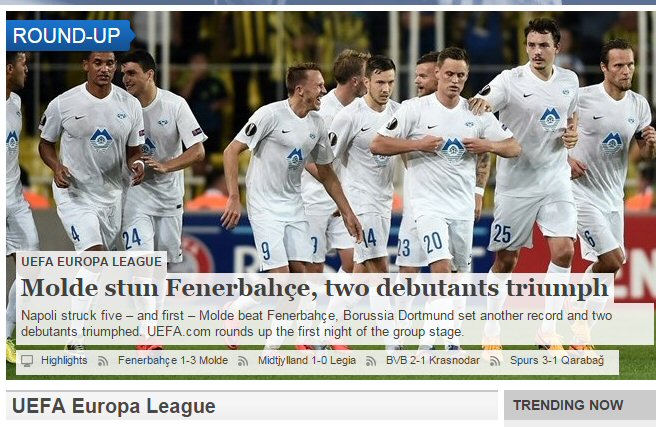 UEFA Avrupa Ligi A Grubu ilk maçında deplasmanda Fenerbahçe'yi 3-1'lik skor ile yenen Molde UEFA'da manşet oldu. Fenerbahçe'nin Molde karşısında aldığı yenilgiyi günün süprizi olarak belirleyen UEFA, "Molde, Fenerbahçe'yi sersemleştirdi" ve "Molde'den Fenerbahçe'yi şok eden galibiyet" başlıkları attı.