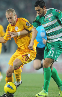 Galatasaray'ın başarılı savunma oyuncusu Tomas Ujfalusi karşılaşmanın 22. dakikasında Bursaspor kalesinde tehlike yaratan isim oldu.