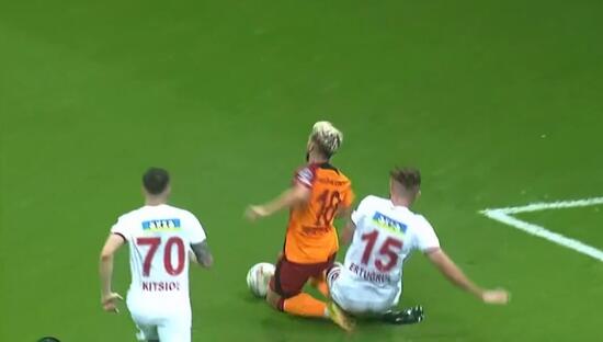 Karşılaşmanın 45+3. dakikasında Kerem Aktürkoğlu, Gaziantep FK ceza sahasında yerde kaldı ve Galatasaray penaltı bekledi.