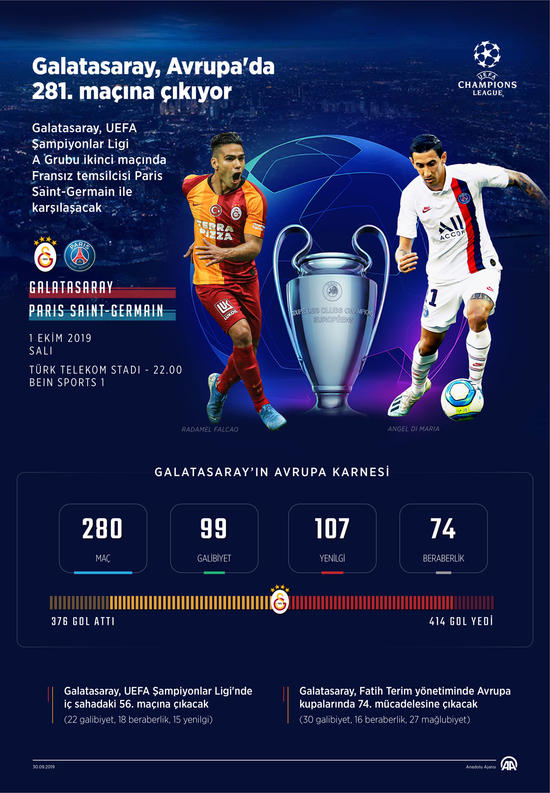 UEFA Şampiyonlar Ligi A Grubu ikinci maçında Fransa temsilcisi Paris Saint-Germain (PSG) takımını konuk edecek Galatasaray, Avrupa kupalarında 281. karşılaşmasına çıkacak.