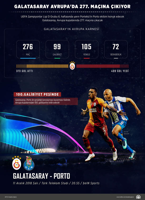 Galatasaray, UEFA Şampiyonlar Ligi D Grubu 6. ve son hafta maçında Portekiz temsilcisi Porto'yu konuk edecek. Türk Telekom Stadı'nda saat 20.55'te başlayacak müsabakayı, Belaruslu hakem Aleksei Kulbakov yönetecek. Mücadele beIN Sports 1'den naklen yayınlanacak.