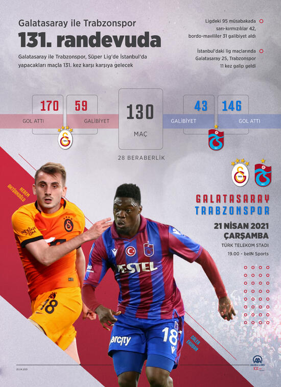 Galatasaray ile Trabzonspor, Süper Lig'de yarın İstanbul'da yapacakları maçla 131. kez karşı karşıya gelecek. İki ekip arasında, Trabzonspor'un şimdiki adıyla Süper Lig'e yükseldiği 1974-1975 sezonunda başlayan 47 yıllık rekabette yapılan resmi ve özel 130 karşılaşmanın 59'unu Galatasaray, 43'ünü Trabzonspor kazandı, 28 müsabakada ise taraflar birbirlerine üstünlük sağlayamadı. Lig, Türkiye Kupası, Cumhurbaşkanlığı Kupası, Başbakanlık Kupası, TSYD Kupası ve özel maçlar olmak üzere geride kalan karşılaşmalarda Galatasaray 170, Trabzonspor ise 146 kez gol sevinci yaşadı.