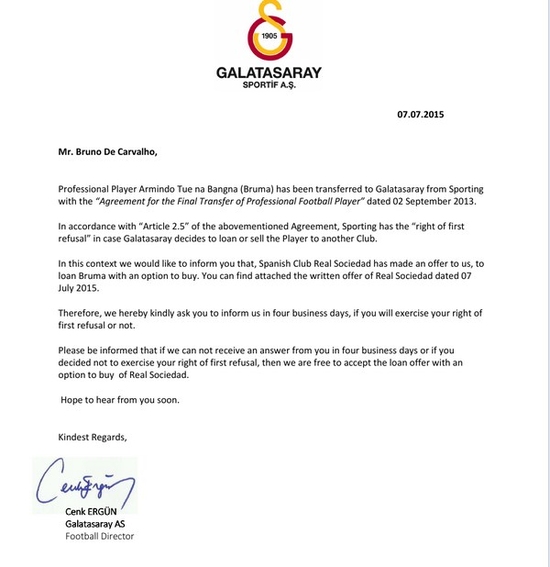 Galatasaray'ın Bruma'yı Sociedad'a kiralarken, gelen resmi teklifi Sporting'e de gönderdiği ve Portekiz kulübünden Bruma'yı almak isteyip istemedikleri soruldu. Galatasaray Sportif Direktörü Cenk Ergün imzalı ve kulüp logolu antetli kağıt da servis edilen belgeler arasında...