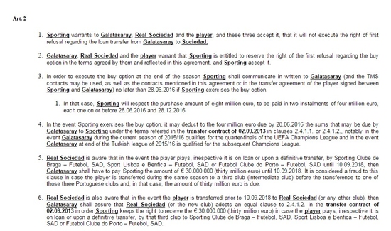 Servis edilen belgelere göre; daha önce çok konuşulan ancak taraflar tarafından resmi bir şekilde doğrulanmayan Bruma'nın sözleşmesindeki "Porto, Benfica ya da Braga'ya 2018'den önce transfer olması durumunda Galatasaray 30 milyon euro ceza öder" maddesi var. Ayrıca, Bruma'nın Galatasaray'dan başka bir kulübe kiralanması ya da satılması durumunda Sporting'in bu teklifi 4 gün içinde eşitleyerek satın alma hakkı bulunuyor.
